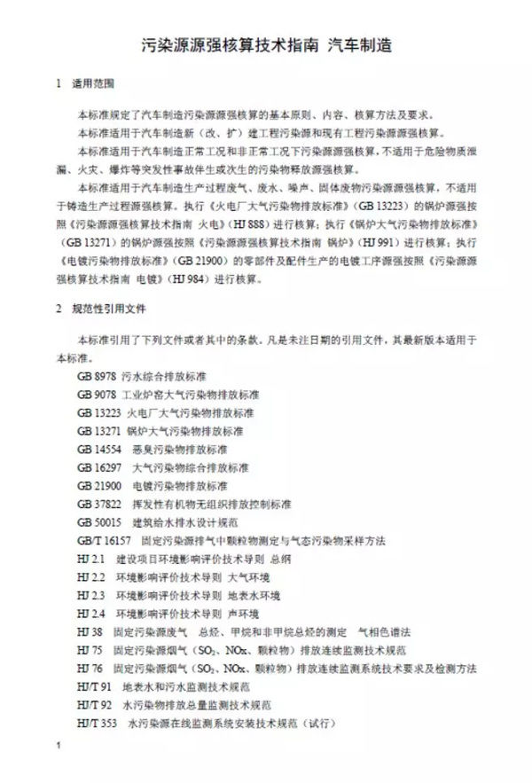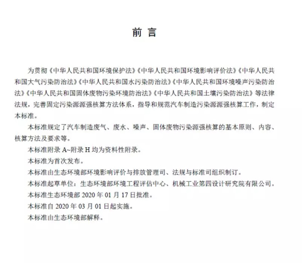 為貫徹《中華人民共和國環境保護法》《中華人民共和國環境影響評價法》《中華人民共和國大氣污染防治法》《中華人民共和國水污染防治法》《中華人民共和國環境噪聲污染防治法》《中華人民共和國固體廢物污染環境防治法》《中華人民共和國土壤污染防治法》等法律法規,完善固定污染源源強核算方法體系,指導和規范汽車制造污染源源強核算工作,制定本標準。